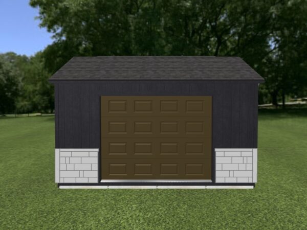 Looking for a storage shed that really stands out? This charming black garage is accented with with beautiful stone wainscot that creates a sharp, bold look. The custom wood-grained walnut garage door adds a sleek, modern touch while providing ample space to park a mower or golf cart. Thoughtfully designed for both appearance and practicality, this garage shed even includes 4 electrical outlets on the back wall!