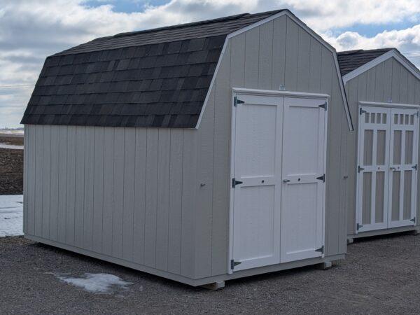 Compact and sturdy, this barn style features a classic hip roof for added overhead storage options. We can still add a storage loft, shelving, or both! Ideal for storing for tools or a lawn mower, it’s a space-saving addition to any backyard!